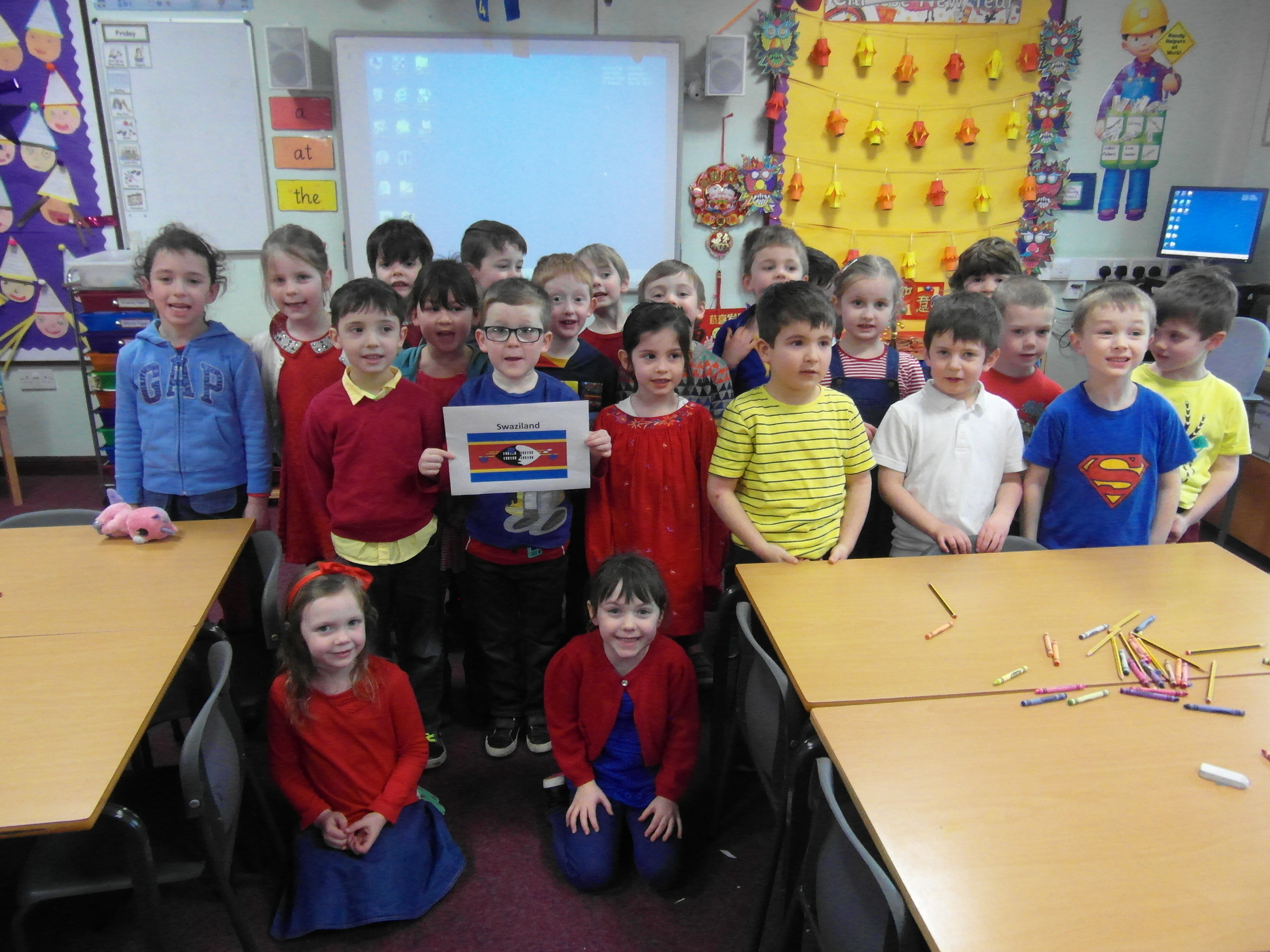 Being in on the morning of the non-uniform day was great because it meant that we could see the kids in all of the colours of their flags, and they all looked brilliant! I was especially impressed with P1 who had Swaziland (lots of nice bright primary colours for them in that one) and P7 who had Honduras (but then I might be a little biased there!).