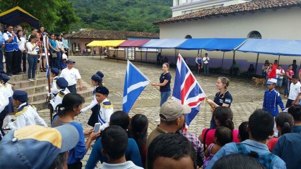 We arrived at the bridge that was to be the starting point for the parade at 8 en punto but in true Honduran style nobody moved until at least half 8. We were in the second group at the front of the escuela‘s part of the parade, with me proudly holding the Scottish flag high and Amy holding the Union Jack with a little less fervour (she had been promised that they had an English flag for her but it seems Britain and England are interchangeable here…). We paraded along the main street that runs through town before circling the main square, where we even got a shout out over the microphone!