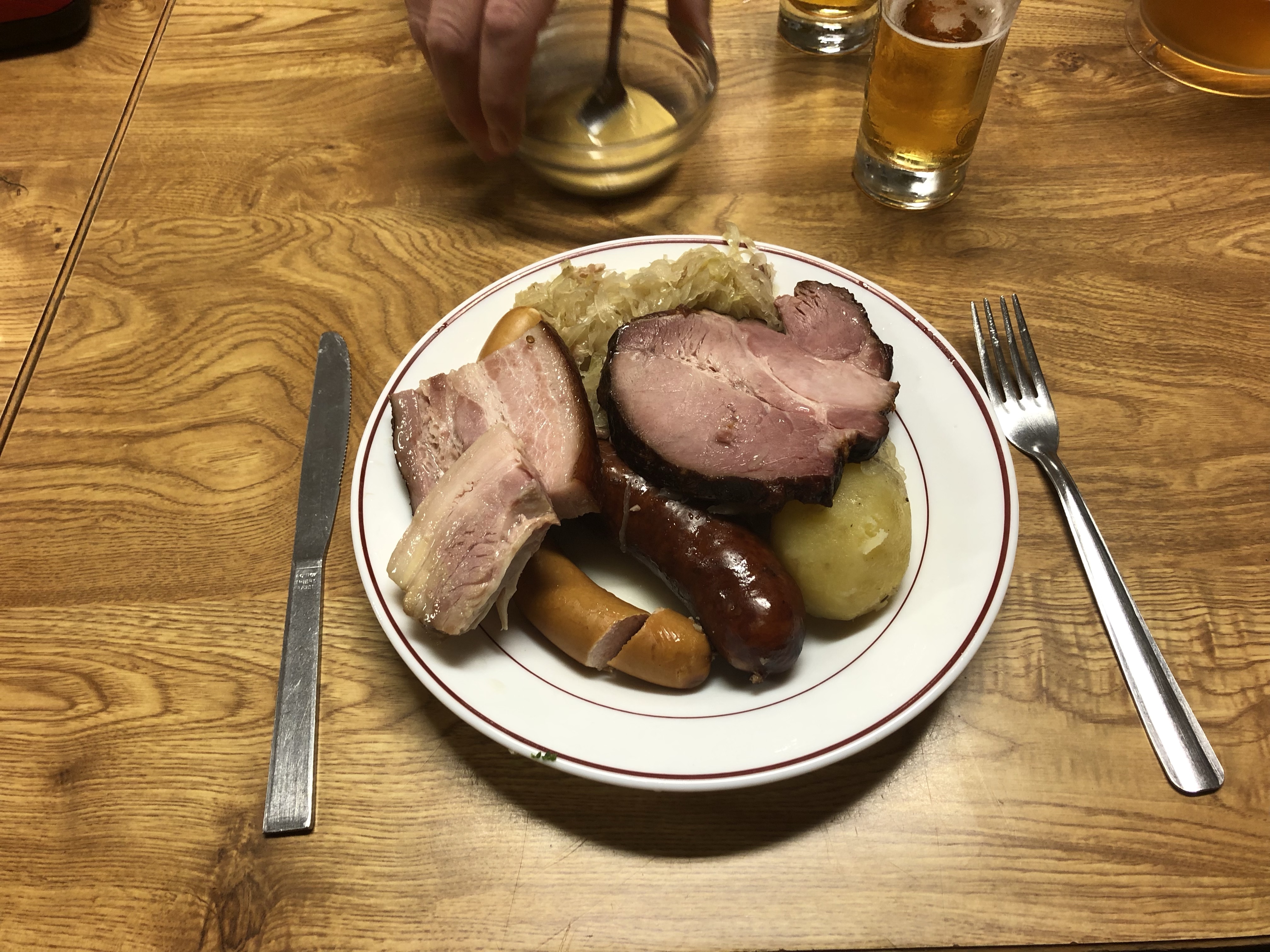 Continuing with the theme of new foods, I’ve continued my mission of trying more Alsatian foods. First up are Moricettes. Imagine a little sandwich made out of pretzel dough and that’s a Moricette. There is a chain of sandwich shops in Alsace calles Poulaillon and it was the owner of this chain that first created the Moricette, right here in Mulhouse. I even heard that it was named after his wife! You can put whatever sandwich filling you want in it and it’s very tasty. I’ve also been able to try a few more dishes with my water polo team who sometimes go out for dinner after training on a Friday night. We head to the rugby clubhouse which is just behind the pool and crash the club dinner where they are often serving up an Alsatian specialty. I’ve been able to try choucroute and spaetzle there. Choucroute is a dish that combines sauerkraut with various sausages, other meat and sometimes potatoes. No complaints from me! Spaetzle are a thick egg pasta, more similar to gnocchi in my opinion than actual pasta. I tried it served with gravy and an assortment of meat. Both are very hearty dishes which I’m learning is very typical of Alsatian food. Last up is a bit of Alsatian-British fusion from when I went round to my friend Àine’s house for lunch a while ago. She lives with her boyfriend and his sister who are half French and half British so the plan was to make toad in the hole but with a mix of Alsatian sausages. Despite a slight gravy mishap, overall it was a success!