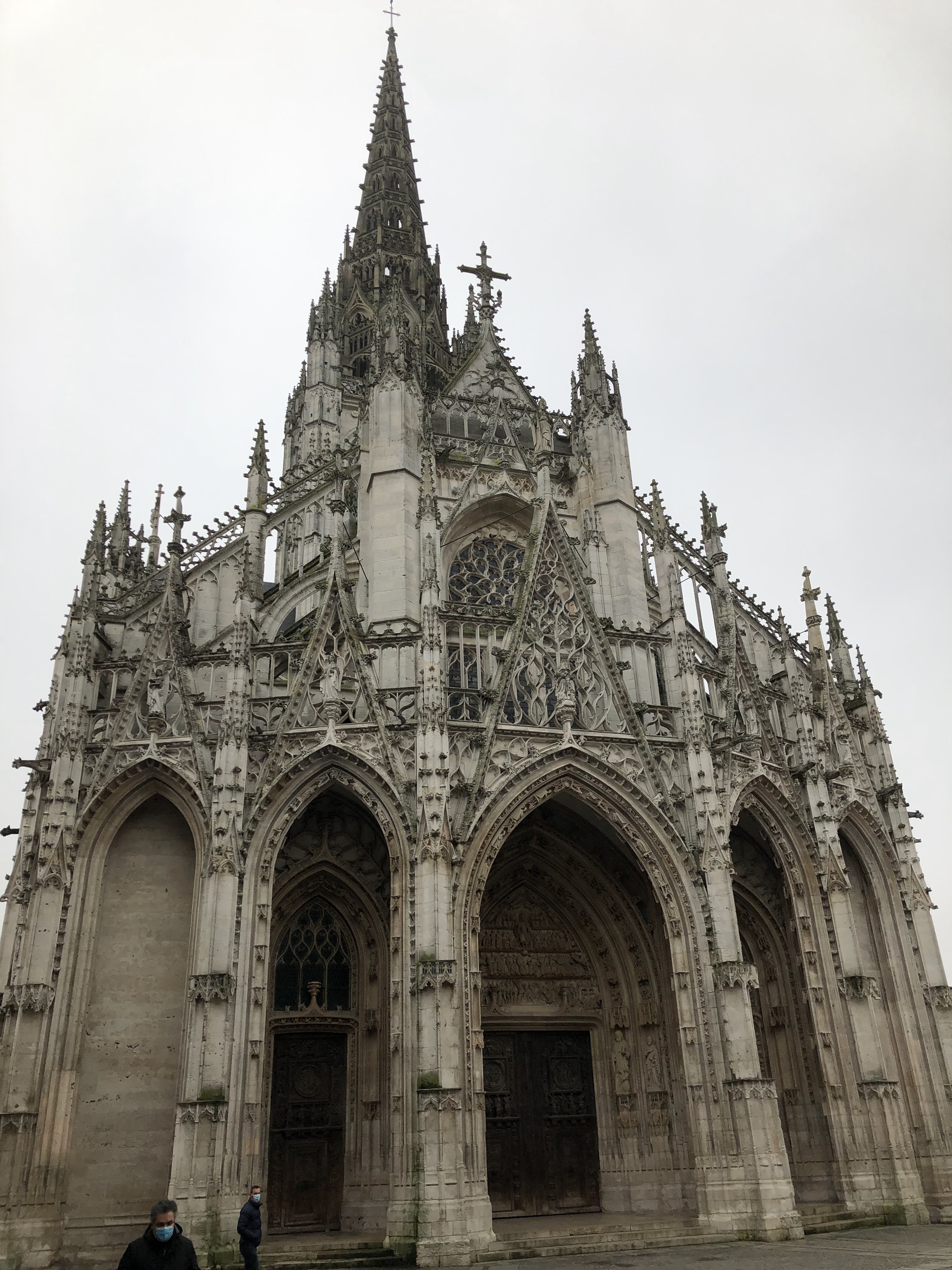 Anna met me at the station and we walked over to her little studio apartment which was only five minutes away. After a quick lunch we headed out to wander around the city a little. Normandy is well known for being very misty and grey and lived up to that but its personality still managed to shine through even if the sun couldn’t. It has a lot of buildings that look similar to those in Alsace, half timbered and brightly coloured, but it also has a lot of Gothic architecture. It’s known as the city of cathedrals and churches because there are so many. You turn every corner and come across another one. The Notre-Dame Cathedral (not the one you’re thinking of) is one of Rouen’s main attractions and actually reminded me a lot of the cathedral in Strasbourg at first. It definitely has a much more Gothic style though. Claude Monet has a famous series of paintings of the cathedral at different times of day, some of which you can see at the Musée d’Orsay in Paris. It has three towers, all built in different styles, one of which is called Le Tour de Beurre (The Butter Tower). This is because people who donated to its construction at the end of the 15th century were given special permission to consume butter and dairy during Lent. (Side note – Normandy is apparently well known for its butter as well as cider.)