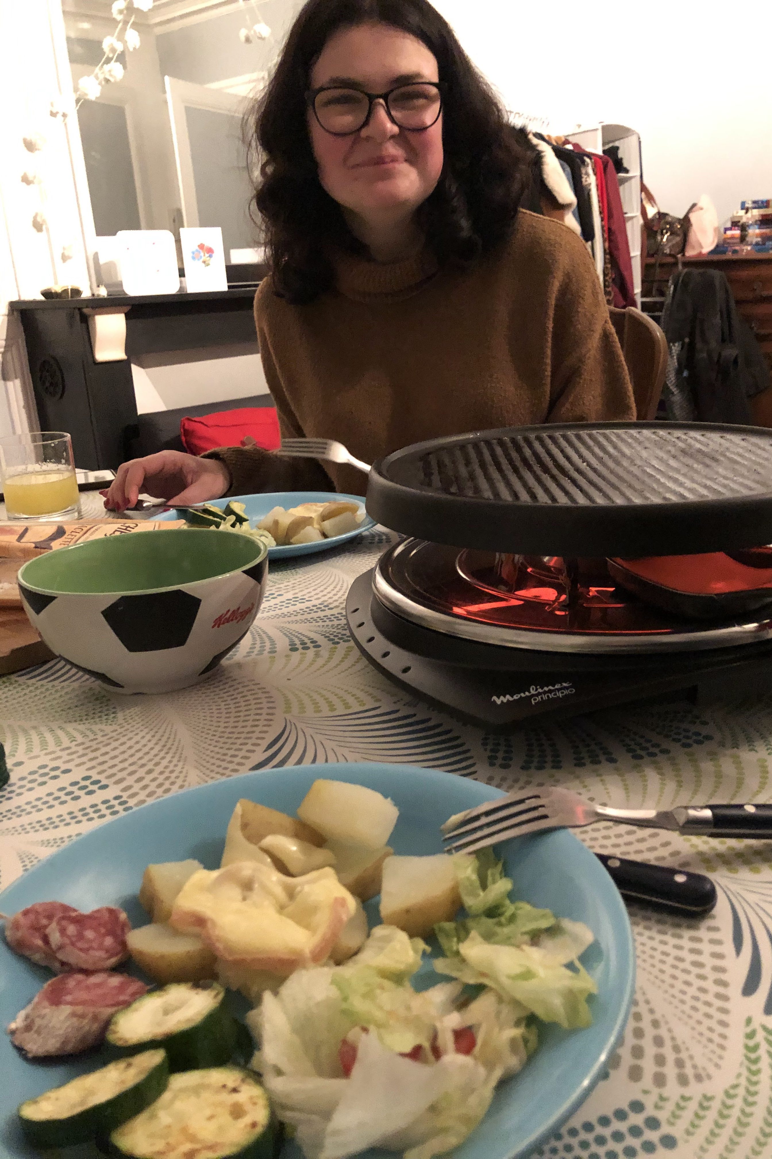 The plan for the evening was to celebrate Anna’s birthday with a few of her friends and have raclette for dinner! You might know raclette as the dish where half of a wheel of cheese is heated until it starts to melt, at which point the cheese is scraped off and onto the common sides of potatoes, gherkins, pickled onions and an assortment of dried meat. However, there are also raclette grills that are much easier to use at home. They consist of a round grill surface with a space underneath to put little trays with individual slices of raclette cheese. This is the set up we had, with some potatoes, saucisse, grilled courgette and a wee side salad as accompaniments.