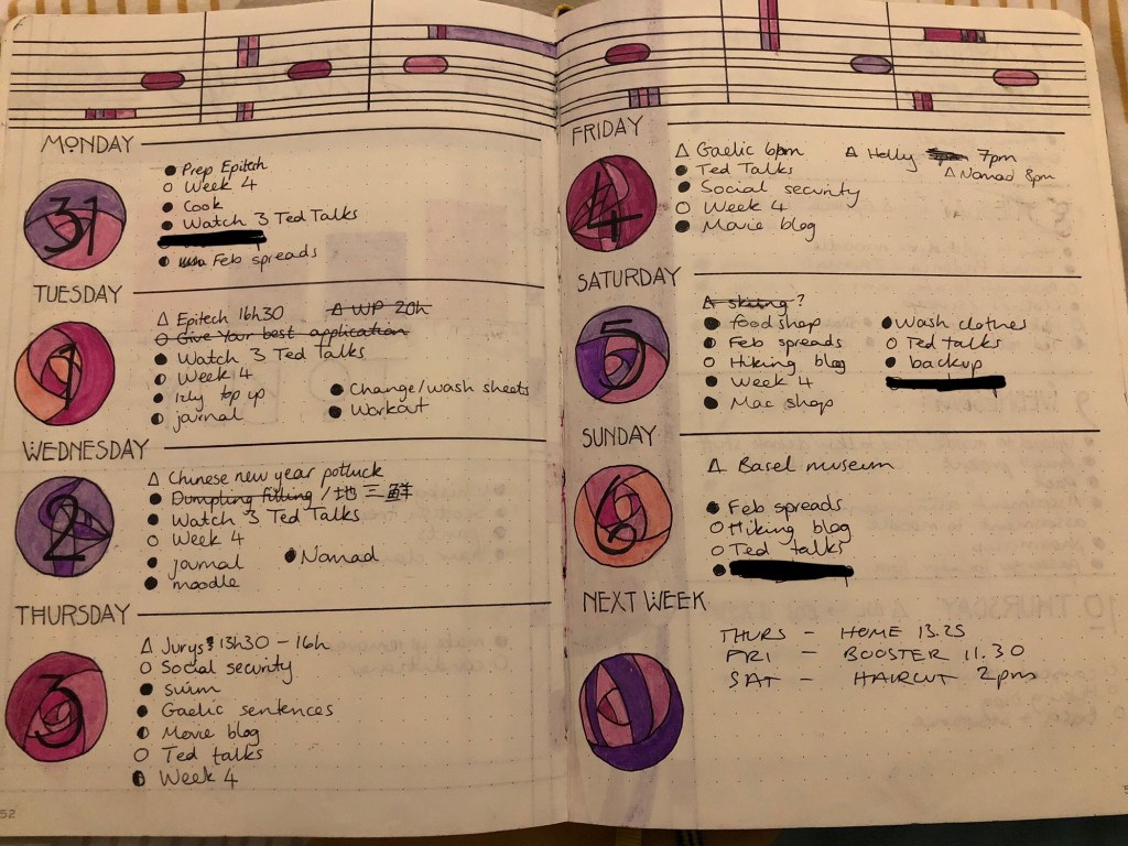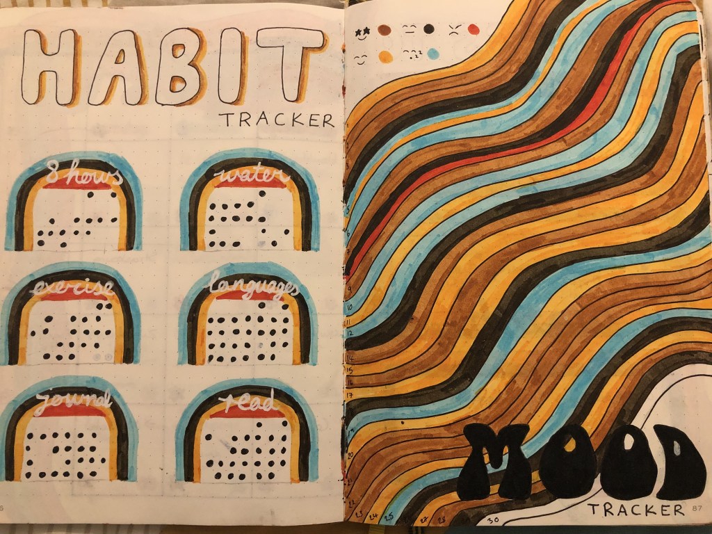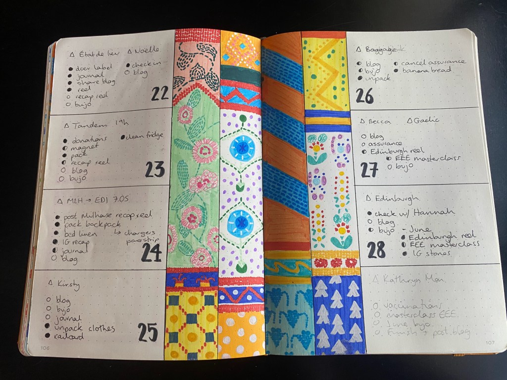 I held back from doing this in March, which also would have fit with the mosaic theme, and instead did this in May because at this point, I was still living in France but had finished my job there. This meant that I had a lot of down time that I could spend on this and it needed it! I know I just said that I like a limited colour scheme but that’s mostly for convenience, so I don’t have to carry around a lot of different coloured pens. I also love the maximalist design aesthetic and this definitely leaned much more into that! It took a long time to initially pick out the colours for each pillar for the cover page but it was a little easier for the rest of the month after I knew what I was doing. I think I actually managed to get the mosaic tiling to look pretty close just using my felt tips pens.